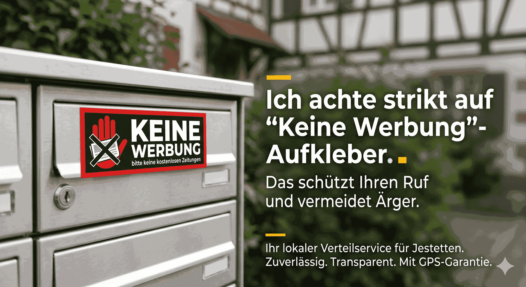 Wir legen großen Wert auf Qualität i Zuverlässigkeit. Unsere Zustellung erfolgt diskret und ordentlich – alle Flyer werden vollständig in die Briefkästen eingeworfen, um sie vor Witterungseinflüssen zu schützen. Als Nachweis unserer Arbeit erhalten Sie auf Wunsch eine Fotodokumentation oder ein GPS-Protokoll der Verteilung.